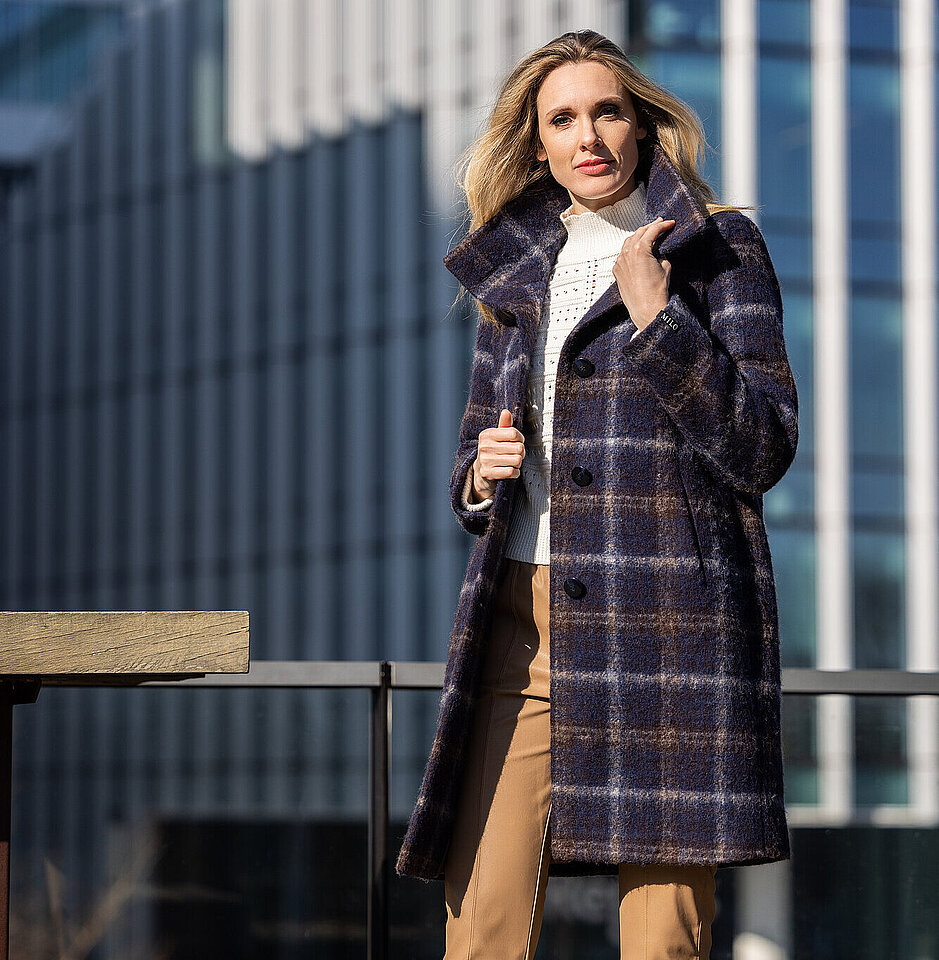 Die modischen Mäntel werden aus italienischen Tweeds, Karos und strukturierten Unis von unseren Designern entworfen.